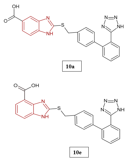 Hypertension is a major global health concern and a leading contributor to cardiovascular disease, stroke, and renal complications. Despite the wide range of available therapies, the growing prevalence of resistant hypertension underscores the need for more potent and safer treatment options. Current antihypertensive agents act through different mechanisms, including suppression of the renin–angiotensin–aldosterone system (RAAS), calcium channel inhibition, β-adrenergic receptor blockade, and diuretic action22. In drug development, heterocyclic ring systems have been particularly valuable, providing structural diversity and enhanced pharmacokinetic properties. Within this context, the benzimidazole ring has emerged as an important pharmacophore in antihypertensive drug design due to its strong interaction with the angiotensin II type 1 (AT?) receptor. Several widely used angiotensin II receptor blockers (ARBs), including losartan, candesartan, and telmisartan, contain a benzimidazole core, which is key to their high receptor affinity, selectivity, and favorable pharmacological profiles23. Abraham Gutiérrez-Hernández et al. (2024) reported the synthesis of seven benzimidazole derivatives, with their structures confirmed through spectroscopic analyses. Biosimulation studies indicated that compounds 10a–10g were computationally safe hits, displaying favourable pharmacodynamic and biopharmaceutical profiles, with predicted AT? Ang II receptor antagonism and minimal cardiotoxic risk. Among them, compounds 10a and 10e showed the greatest potential in silico. Ex vivo assays revealed that compound 10a exerted a dual vasorelaxant effect, functioning both as an insurmountable AT? receptor antagonist and as a partial inhibitor of the L-type CaV1.2 calcium channel. Molecular docking further clarified the binding interactions of compound 10a within both targets, supporting its multitarget mechanism. In vivo evaluation using a spontaneously hypertensive rat (SHR) model demonstrated that intraperitoneal administration of compound 10a (20 mg/kg) reduced systolic blood pressure by 25%, validating its ex vivo vasorelaxant and multitarget antihypertensive activity. The study emphasized the critical role of the biphenyl moiety in compound 10a and highlighted the consistency between computational predictions and experimental findings, underscoring the effectiveness of rational drug design in developing multitarget antihypertensive agents24.