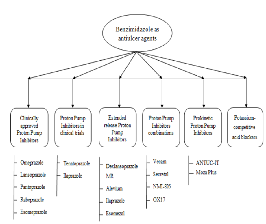 Peptic ulcer disease remains a major health concern worldwide, particularly in developing countries. The identification of H+/K+ ATPase as the key gastric proton pump has led to significant interest in its inhibition for gastric acid control. This paved the way for the development of benzimidazole sulfoxide–based antisecretory drugs. Timoprazole was the first well-characterized proton pump inhibitor, later followed by more effective agents such as picoprazole and omeprazole. Owing to their strong biological activity and broad therapeutic potential, synthetic benzimidazole derivatives continue to play an important role in managing various pathological conditions13.