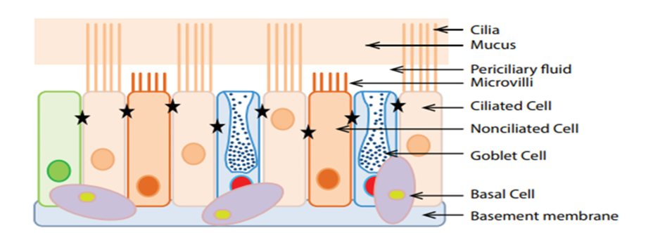 There are mainly four types of cells present in the nasal epithelium attached to basement membrane: Basal cells, goblet cells, ciliated cells, and nonciliated cells. Out of which goblet cells, ciliated cells and nonciliated cells are attached to each other through tight junction between cells (shown by blue star). The mucus layer is present over the periciliary fluid which acts as lubricating layer and provides sliding movement to mucus layer in ciliary clearance mechanism. These cells and tight junction also contribute to different drug absorption mechanisms [37].