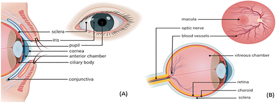 Fig 4: Schematic representation of the (A) anterior ocular anatomy (B) posterior ocular anatomy [28]