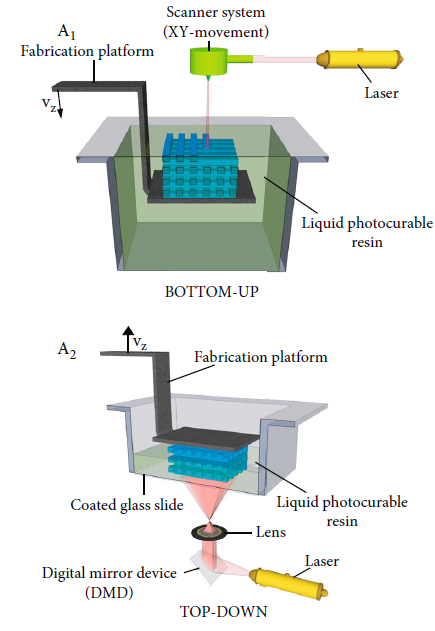 Stereolithography is a well-known technology comprises of various vat-photopolymerization techniques where photopolymerized liquid resins are radiated using a single laser beam, digitally projected UV-light source (DLP) or two-photon polymerization. The components of a standard SLA printer are a resin-filled tank, a perforated platform lowered into the tank, a light source, and a computer that controls the platform and glow source. When the resin cures and the laser scans the platform, a thin coating of the photopolymer is created. It is possible to print intricate structures with great resolution by repeating the process. The spot size of the applied laser beam affects resolution. SLA printers employ a top-down method when light exposures are from the bottom of the build platform, or a bottom-up method with light exposures from the top, as seen in figure. Cell-free or cell-laden microstructures have been created using a variety of photocurable polymers, including e-caprolactone, poly(ethylene glycol) diacrylate, poly(2-hydroxyethyl methacrylate), and di methacrylate.20