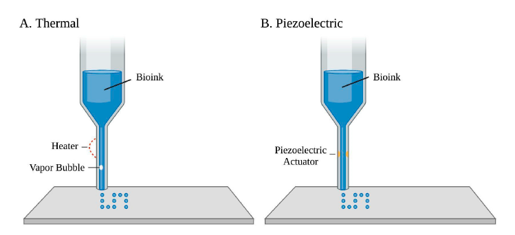 Figure.1: (A) Localized heating is used in thermal-based bioprinting to create vapor bubbles and eject ink droplets. (B) In piezoelectric-based bioprinting, droplets are produced by passing an electric current through a piezoelectric actuator.