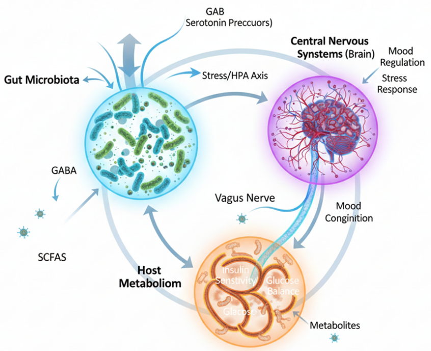 The last decade has witnessed a transformative shift in biomedical science with the recognition that the human microbiome plays an active, dynamic role in regulating host physiology. Beyond its classical functions in digestion and nutrient synthesis, the gut microbiota is now understood as a complex endocrine-like organ that influences metabolic homeostasis, immune signaling, and neural processes. This evolving concept, often referred to as the microbiome metabolism brain axis, highlights the bidirectional communication between intestinal microbes, metabolic pathways, and central nervous system (CNS) function. Mounting evidence from preclinical and translational studies demonstrates that alterations in microbial composition termed dysbiosis can modify host metabolic signalling, triggering neurochemical and behavioral changes relevant to mood, cognition, and stress responses.
