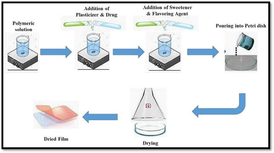 5. Rolling method the rolling method is a film-forming technique used in the production of mouth-dissolving films. In this process, a medicated solution, prepared using a water-and-alcohol-based solvent, is coated onto a carrier material. Once the film dries on rollers, it is cut into the desired shapes. To prepare the formulation, water-soluble hydrocolloids are first dissolved separately in water to form a uniform and viscous base. Simultaneously, the active pharmaceutical ingredient (API) and other excipients are dissolved in a small amount of water using a high-shear processor, ensuring proper dispersion before being combined with the base solution for film casting. [26]