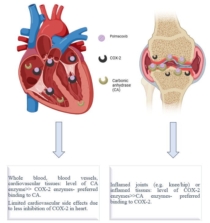 CDSCO Approval: Polmacoxib 2mg indicated for treatment of Idiopathic (primary) osteoarthritis of Hip/Knee approved by CDSCO dated 01.05.2023 23 Since cardiovascular (CV) side effects of traditional NSAIDs and COX-2 inhibitors are linked to COX-2 inhibition in the CV system where CA is abundant, this interaction is particularly significant.24 Functionally, CA inhibition is believed to counteract the hypertensive effects that typically follow COX-2 inhibition.25 Polmacoxib was first approved in South Korea in 2015 for the management of colorectal cancer and osteoarthritis. Low-dose polmacoxib administration has shown minimal impact on overall CA function within the circulatory system. In contrast, inflamed tissues tend to be CA-deficient while exhibiting increased COX-2 expression due to inflammatory processes. Since synovial fluid contains negligible CA, polmacoxib effectively inhibits COX-2 in inflamed joint tissues, leading to reduced inflammation and pain relief. Erythrocytes play a crucial role in the pharmacokinetics of polmacoxib by serving as a reservoir, safely transporting the drug in an inactive form to tissues with low CA activity, such as arthritic joints. Polmacoxib achieves 85- to 100-fold higher concentrations in whole blood (i.e., within erythrocytes) compared to plasma, which lacks CA. This mechanism ensures tissue-specific drug delivery, providing sustained therapeutic levels in CA-deficient inflamed tissues. As a result, systemic exposure remains low, as polmacoxib is carried in a bound state with CA inside erythrocytes. This selective transport mechanism enhances its effectiveness in osteoarthritic joints while minimizing adverse effects on the cardiovascular, renal, and gastrointestinal systems.26