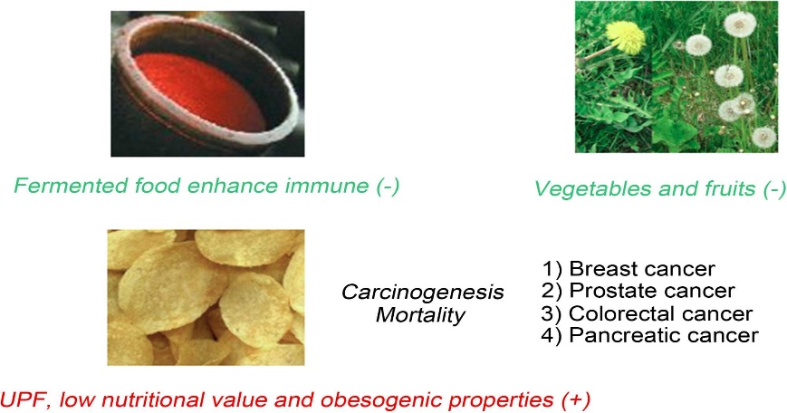 Fermented foods have been shown to be beneficial against cancer, but UPF raises the chance of developing cancer and is linked to an increased risk of dying. Furthermore, we have discovered that a number of malignancies, mostly those of the breast, digestive, and urinary systems, are linked to food.