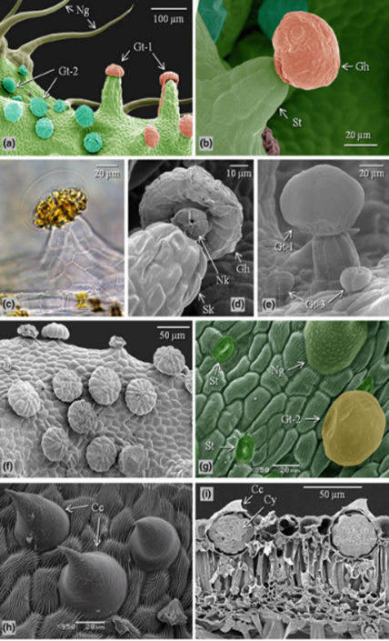 Fig. 1.2 In C. sativa, glandular and non-glandular trichomes a) Area of the bract with glandular and non-glandular trichomes b) glandular disc and cuticular membrane in c) and a slightly ruptured “neck” of the glandular head displaying a 4-cell arrangement in d) e) A capitate stalked glandular trichome along with two of the bulbous glandular trichomes f) A group of capitate sessile glandular trichomes on a developing leaf g) The abaxial surface of leave containing sessile glandular trichome h) The morphologyof conical cystolith trichomes on the adaxial leaf surface i) Cystolith trichomes in sectional view displaying large cystolith crystals. Ng non-glandular trichome; Nk neck; Sk stalk; St stomata; Gh glandular head; Gt-1 capitate stalked glandular trichome; Gt-2 capitate sessile glandular trichome; Gt-3 bulbous glandular trichome