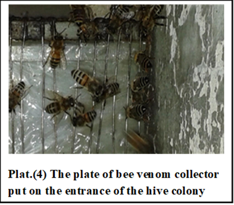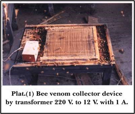 The collection of bee venom was scheduled as follows: Electric shock method design plat: 2 was used for bee venom collecting set on the colony entrance below the experiment production as Suggested by Benton et al. (1963), Nobre, (1990), Khattab, (1997), and El Ashhab (2002) (36), (37), (38), (39)