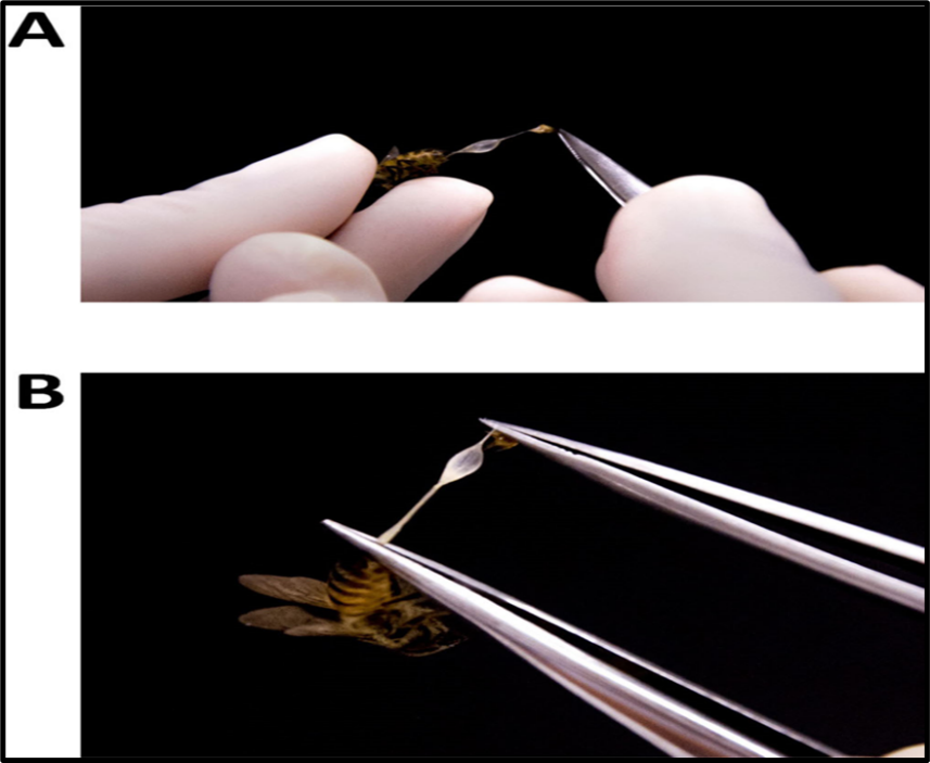 The Procedures for dissecting and separating the sting apparatus's venom reserves has been shown in figure no. 5 : (A) Use all-purpose fine-tipped tweezers to pull the venom reservoir and sting mechanism out of the bee's body; (B) After the two structures are fully extracted from the bee's body but remain together, use two tweezers (or one pair of micro scissors and one pair of tweezers) to separate them (35).