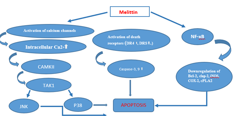 Bee venom and melittin demonstrate anti-tumor properties by activating both extrinsic and intrinsic apoptotic pathways. They enhance the expression of pro-apoptotic factors such as cytochrome C, p53, Bax, Bak, Caspase-3, Caspase-9 and death receptors, while simultaneously decreasing the levels of the anti-apoptotic protein Bcl-2. However, they inhibit NF-kB and Ca2+/CaM signaling pathways, which in turn suppresses proliferation, angiogenesis, invasive and metastasis. As a result, tumor growth and survival are significantly diminished. They also raise the amounts if AIF and EndoG, which promotes caspase-independent apoptosis (53).