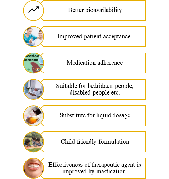 Advantages of Chewable Tablets: [11] Chewable tablets are generally chewed in the mouth prior to swallowing and are not expected to swallow intact. Main purpose of chewable tablet is to provide proper unit dosage form of medication which can easily be administered to children or to the elderly who have difficulty in swallowing a tablet intact.