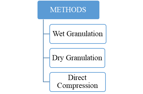 Wet Granulation: One of the most commonly used methods. It utilizes a Granulating fluid such as water, Isopropanol, ethanol to transform the fine powder into Larger, stronger agglomerates called as Granules. The Granulating fluid may be used alone or can be used as a solvent along with binder. In a Traditional Wet granulation practice, the wet mass is forces to pass through a sieve and the wet grains are dried later.