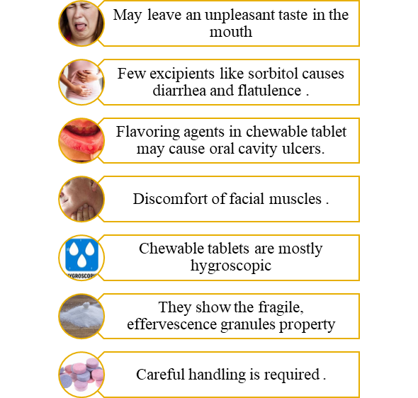 Disadvantages of Chewable Tablets: [8] There are, of course some limitations to the use of chewable tablets having bad tasting drugs and extremely high dosage level.