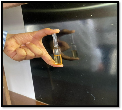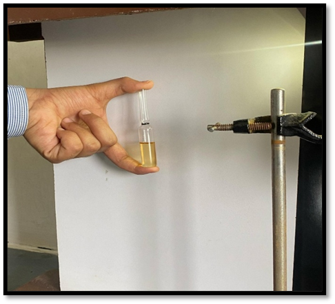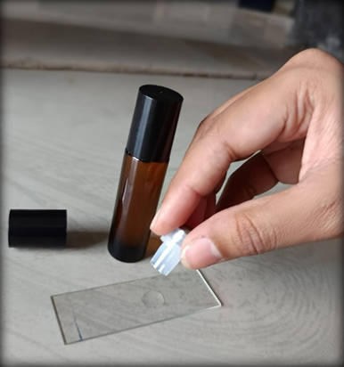 The clarity test was performed to assess the physical uniformity and visual appearance of the cinnamon-based roll-on formulation. The formulation was observed against a black and white background under adequate lighting. It appeared completely clear and transparent, with no visible particulate matter, phase separation, or turbidity. The absence of suspended particles and any signs of crystallization indicated that all ingredients were uniformly dissolved or dispersed within the formulation.