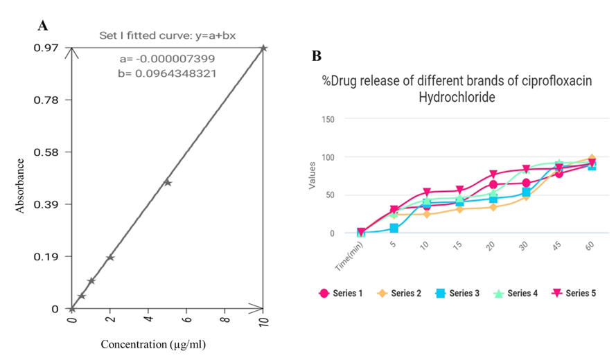 Assessing drug potency in tablets is vital to confirm the strength and amount of the active ingredient in each dosage form. In this study, a standard ciprofloxacin HCl stock solution was prepared by dissolving 100 mg of the pure compound in 0.1N HCl and diluting it to 100 mL to obtain a 1000 µg/mL concentration. A secondary stock solution (100 µg/mL) was made by diluting 10 mL of the primary solution to 100 mL, followed by further dilutions to create calibration standards at concentrations of 0.5, 1, 2, 5, and 10 µg/mL. The absorbance of each standard was measured at 276 nm using a UV spectrophotometer, and a calibration curve was plotted with absorbance on the Y-axis and concentration on the X-axis. For tablet evaluation, samples from different brands were finely ground, and a portion equivalent to 100 mg of ciprofloxacin was dissolved in 100 mL of 0.1N HCl to produce a 100 µg/mL solution. This solution was further diluted by taking 4 mL and making it up to 100 mL with 0.1N HCl. The absorbance of each sample was measured at 276 nm against a blank. According to Pharmacopeial guidelines, ciprofloxacin HCl content must fall within 90–110% of the labeled amount per the USP-NF, and 95–105% as per the British Pharmacopoeia [30]. Dissolution testing for all ciprofloxacin generic formulations was conducted using a basket-type dissolution apparatus (Veego), set at 37 ± 0.5°C with a rotation speed of 100 rpm. The dissolution medium consisted of 1000 mL of 0.1N HCl, maintained for one hour. At specified intervals, 5 mL samples were withdrawn through a 0.8 µm syringe filter and replaced with an equal volume of fresh medium. The concentration of the dissolved drug was analyzed on a UV/Visible spectrophotometer at 276 nm.