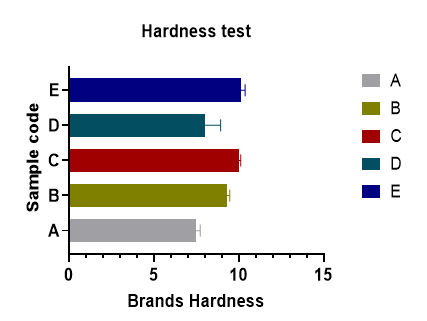 Figure 2. Hardness of Various Brands, Mean & Standard Deviation. The ANOVA of the Hardness of Various Brands was statistically significant with a p-value of <0.0001. Data are presented as mean and standard deviation from 10 different runs.
