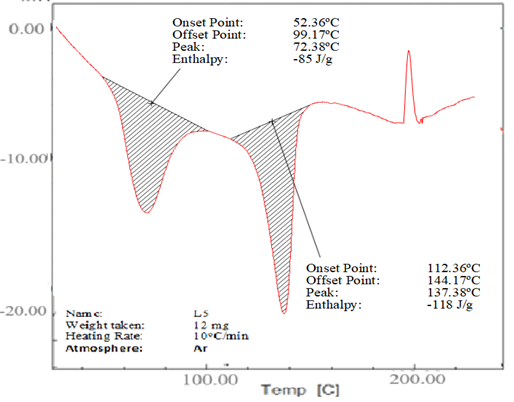 The drug's thermotropic behaviour and physical condition in the co-crystal were assessed by using DSC analysis. Important details concerning co-crystals, including their melting temperature, enthalpy of fusion, thermal transition temperature, and crystallinity, can be obtained via differential scanning calorimetry. Nevertheless, two endothermic peaks at temperatures below the melting points of tartaric acid and lopinavir alone were seen in the distinctive endotherm of co-crystal L5 (Figure 4c). At 72.38oC, the first endothermic peak appeared, possibly as a result of the eutectic mixture melting. Co-crystal melting was shown by the second endothermic peak, which was located at 137.38°C. The depression in melting point with co-crystal was caused by the decrease in particle size and increase in surface area. Co-crystals of lopinavir showed a decrease in its melting point, suggesting an interaction between lopinavir and tartaric acid. This shift in melting point was due to change in crystal lattice of lopinavir in the presence of co-former, forming a comparatively distinct crystal lattice in co-crystals. Jassim et al. found similar results in the DSC scan of dextromethorphan HBr co-crystals with tartaric acid.25 Reduced melting events have a positive influence on the solubility of the product.