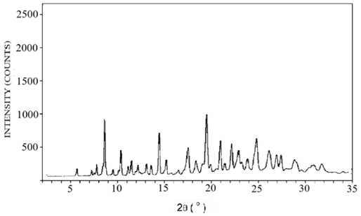 The diffraction patterns of pure lopinavir, tartaric acid, and co-crystal L5 are shown in Figure 5. The diffraction pattern of pure lopinavir (Figure 5a) showed high-intensity peaks at 2-theta values of 4.9°, 7.4°, 8.5°, 9.7°, 12.4°, 12.8°, 14.8°, 16.3°, 17.4°, 18.3°, 20.9°, and 21.8°, suggesting its crystalline nature. The diffraction pattern of tartaric acid (Figure 5b) showed peaks at 20.7°, 21.2°, 28.2 °, 29.8 °, 32.8 °, and 33.4 o whereas in diffraction pattern of co-crystal L5 (Figure 5c), some peaks were displaced and some were absent.