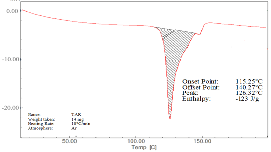 FTIR is an outstanding method for providing insight into the type of investigation into the chemical and physical changes in a substance's molecular structure. FTIR spectroscopy is used to verify co-crystal formation because it may identify variations in chemical structures of sample that point to the production of hydrogen bonding. In the case of co-crystal, peak broadening after 3000 cm-1 (Figure 3c) and decrease in intensity of C=O ketone group of tartaric acid indicates intermolecular hydrogen bond formation that confirms the formation of co-crystals. Similar results were obtained by Varma et al. during the formation of co-crystals of zoledronic acid with tartaric acid.16