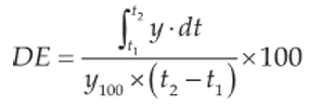 where y is a function of the percentage of drug dissolved at time t D.E. is the area under the dissolution curve between time points t1 and t2 expressed as a percentage of the curve at maximum dissolution, y100, over the same time period. The integral of the numerator, that is, the area under the curve, is calculated using a model-independent method, the trapezoidal method. The area under the curve is the sum of all trapeziums defined by Equation 2: