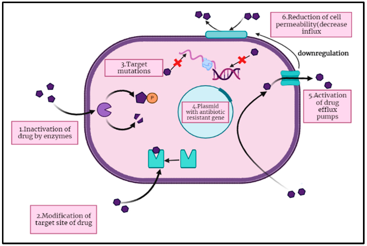 Antibiotics are a class of antimicrobial agents used to prevent and treat bacterial infections. These drugs either kill bacteria (bactericidal) or inhibit their growth (bacteriostatic) by targeting essential bacterial structures and processes, such as cell wall synthesis, protein synthesis, DNA replication, or metabolic pathways [1]. Since the discovery of penicillin by Alexander Fleming in 1928, antibiotics have revolutionized modern medicine, saving millions of lives by effectively treating infectious diseases. Antibiotic resistance is the ability of bacteria to survive and multiply despite the presence of antibiotics that were once effective against them. This occurs when bacteria develop genetic changes or acquire resistance genes from other bacteria, allowing them to neutralize or evade the drug’s effects. As a result, infections caused by resistant bacteria become more difficult to treat, leading to longer illnesses, higher medical costs, and increased mortality rates [2]. Over the years, antibiotic resistance has emerged as a serious global health concern, primarily driven by the overuse and misuse of antibiotics in human medicine, veterinary practice, and agriculture. The rapid spread of multidrug-resistant (MDR) bacteria threatens the efficacy of existing antibiotics, raising the possibility of a post-antibiotic era where common infections become untreatable. Without urgent action, antibiotic resistance could undermine decades of medical advancements, making even routine surgeries, cancer treatments, and organ transplants increasingly risky. Antibiotic resistance occurs when bacteria evolve mechanisms to withstand the effects of antibiotics that were once effective against them. This phenomenon arises due to genetic mutations or the acquisition of resistance genes through horizontal gene transfer. Resistant bacteria can survive antibiotic exposure, multiply, and spread, making infections harder to treat. The development of antibiotic resistance is driven by several factors, including overuse, misuse, and inappropriate prescribing of antibiotics. Additionally, inadequate infection control measures, poor hygiene, and insufficient surveillance systems contribute to the rapid spread of resistant bacteria across communities, hospitals, and the environment [3,4]. The aim of this review is to understand antibiotic resistance from a pharmacological perspective. It will explore the mechanisms by which bacteria develop resistance to antibiotics, including enzymatic degradation, target modification, efflux pumps, and biofilm formation. Additionally, the review will discuss the pharmacokinetics and pharmacodynamics of antibiotics, how misuse and overuse contribute to resistance and the role of novel drug development in overcoming resistance. It will also highlight strategies to combat resistance, such as combination therapy, antibiotic stewardship, and alternative therapies like bacteriophages and antimicrobial peptides.