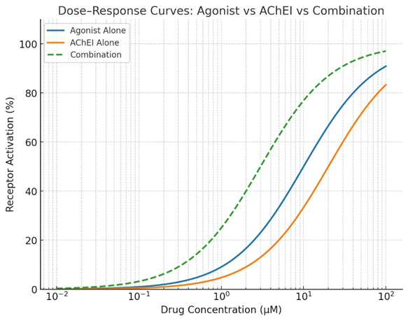 While both therapeutic approaches have demonstrated efficacy independently, emerging evidence suggests that combining cholinergic agonists with AChEIs may yield synergistic benefits. This combinational approach could potentiate cholinergic signaling more effectively than monotherapy, potentially improving cognitive and neuromuscular outcomes. However, such synergy requires careful consideration of pharmacodynamic interactions—such as receptor subtype selectivity, desensitization, and downstream signaling—as well as pharmacokinetic variables, including drug metabolism, bioavailability, and blood–brain barrier penetration.3 Given these complexities, a deeper understanding of their in vitro pharmacological interactions provides an essential foundation for optimizing therapeutic strategies. Exploring receptor-level mechanisms, enzyme inhibition kinetics, and dose–response relationships in controlled systems offers critical insights that may guide clinical applications in neurodegenerative and neuromuscular disorders.4