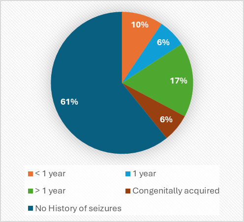 When evaluating past seizure occurrence, 196 patients (39.2%) reported previous episodes, whereas 304 (60.8%) had no prior history. Among those with past history, 9.4% had seizures less than one year, 6.4% had a history of seizures for exactly one year, and 17% had a history extending beyond one year. Notably, 6.4% reported congenitally acquired seizures (Figure - 1,2).