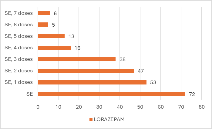 Among 250 cases treated with IV Lorazepam (4 mg), 28.8% achieved stability without requiring repeated doses. Seizure control with one, two, and three additional doses was observed in 21.2%, 18.8%, and 15.2% of cases, respectively. A smaller proportion required four to seven additional doses (6.4%, 5.2%, 2%, and 2.4%, respectively), indicating that the majority responded within the first three doses, suggesting effective stabilization in most patients with limited recurrence.