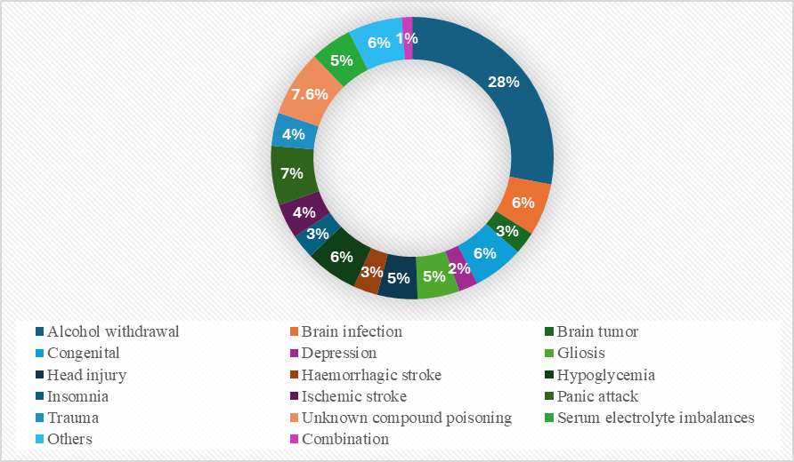 The most common cause identified was alcohol withdrawal (28%), followed by unknown compound poisoning (7.6%), panic attacks (6.8%), brain infections and hypoglycemia (6% each), and others (burns, fractures, etc.) at 6.2%. Less frequent causes included gliosis and serum electrolyte imbalances (4.8%), ischemic stroke (4%), head injury (4.6%), and a small number involving combination factors (1.2%). Other etiologies included brain tumors, congenital causes, depression, trauma, and insomnia (Figure - 3).