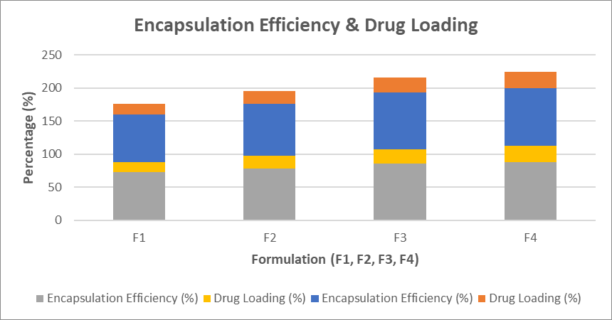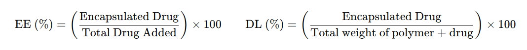 Encapsulation Efficiency (EE) and Drug Loading (DL) were calculated as: