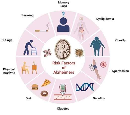 Several acquired or lifestyle-related factors can raise the likelihood of developing Alzheimer’s disease. The most frequently reported among these are cerebrovascular disorders, along with diabetes, high blood pressure, obesity, and abnormal lipid levels.(28)