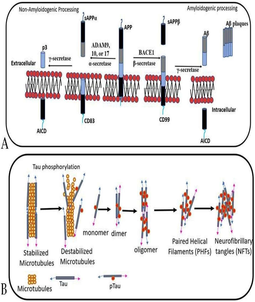 Current explanations for the development of Alzheimer’s disease are largely informed by genetic research and neuropathological observations. These findings suggest that the disease arises from abnormal processing of two key proteins: amyloid precursor protein (APP) and tau. Evidence from molecular biology, genetics, and brain pathology supports the idea that age-related disruptions in the metabolism of APP and tau trigger a cascade of harmful events. This leads to the buildup of beta-amyloid (Aβ) fibrils and tau-based neurofibrillary tangles. The accumulation of these protein aggregates damages neurons and synapses in specific regions of the brain, ultimately resulting in cognitive decline.(3)
