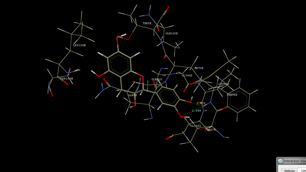 Niranthin was observed to be showing hydrogen bond interactions with TRP47, hydrophobic interactions with GLU46, TRP47, PRO60, PRO61, LYS62, ASP1, ILE2, GLN3, MET4, PRO95, TRP96, THR97, LEU154, and SER156, and Vander wall interactions with LEU45, GLU46, TRP47, PRO60, LYS62, ASP1, ILE2, GLN3, MET4, PRO95, TRP96, THR97, PHE98, LEU154, and SER156. HypoPhyllanthin was observed to be showing hydrogen bond interactions with ARG38, GLN43, and ARG38, hydrophobic interactions with ALA40, GLN43, GLY44, GLU46, LYS62, ASP85, ASP86, GLN3, and THR97, and Vander wall interactions with LEU45, GLU46, TRP47, PRO60, LYS62, ASP1, ILE2, GLN3, MET4, PRO95, TRP96, THR97, PHE98, LEU154, and SER156. Nirtetralin was observed to be showing hydrogen bond interactions with LYS62, hydrophobic interactions with GLN43, GLU46, TRP47, LYS62, ASP1, GLN3, PRO95, THR97, PHE98, GLN100, and ALA153, and Vander wall interactions with GLN43, LEU45, GU46, TRP47, LYS62, ASP1, GLN3, PRO95, THR97, PHE98, and ALA153. Phyllanthin was observed to be showing hydrophobic interactions with ALA40, GLN43, LYS62, ASP85, GLN3, MET4, THR5, THR97, GLY99, and GLN100, and Vander wall interactions with ARG38, GLN43, GLU46, LYS62, PHE63, ARG66, ASP85, ASP86, ILE2, GLN3, MET4, THR97, PHE98, GLY99, and GLN100. Lintetralin was observed to be showing hydrogen bond interactions with GLN43, and MET4, hydrophobic interactions with GLN43, GLU46, LYS62, ASP1, GLN3, MET4, PRO95, THR97, PHE98, GLY99, and ALA1, and Vander wall interactions with GLN43, GLU46, LYS62, ASP1, ILE2, GLN3, MET4, PRO95, TRP96, THR97, PHE98, and GLN155. Isolintetralin was observed to be showing hydrogen bond interactions with LYS62, hydrophobic interactions with GLN43, GLU46, PRO60, LYS62, ASP1, GLN3, THR5, PRO95, GLN100, and ALA153, and Vander wall interactions with GLN43, GLY44, GLU46, TRP47, LYS62, ASP1, GLN3, MET4, THR97, GLN100, and ALA153. Phyltetralin was observed to be showing hydrogen bond interactions with LYS62, hydrophobic interactions with ARG38, ALA40, GLN39, LEU45, GLU46, LYS62, ALA88, THR97, and PHE98, and Vander wall interactions with ARG38, ALA40, GLN43, GLY44, LEU45, GLU46, LYS62, ASP85, and PHE98.