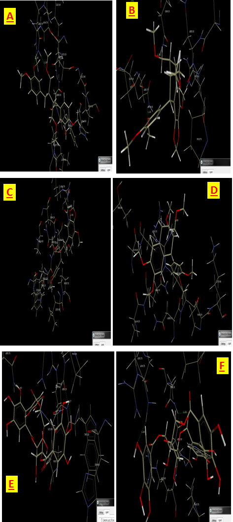 Figure 4: Docking poses of phyllanthus compounds with interacted with acetylcholinesterase(PDB Code: 1EVE). Interaction Poses of (A) Phyllanthin, (B) Hypophyllanthin, (C) Niranthin, (D) Phyltetralin, (E) Corilagin, (F)Isocorilagin.
