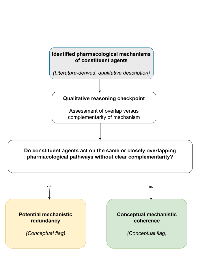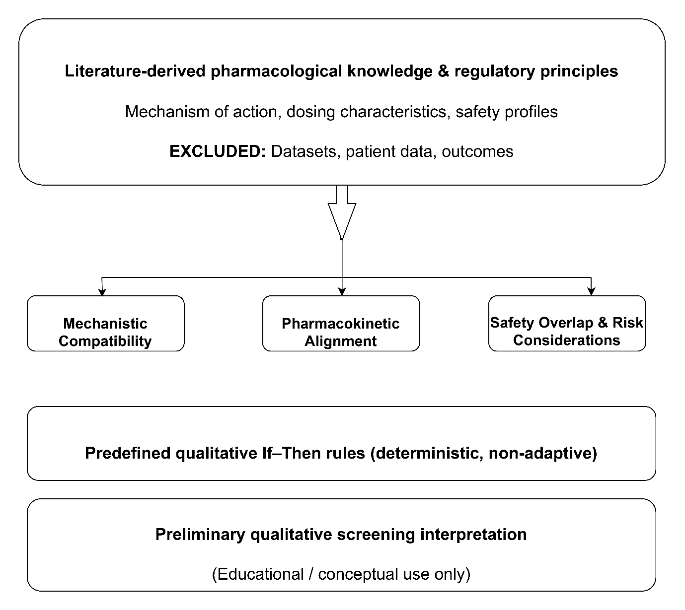As a conceptual methodology, the framework necessarily simplifies complex pharmacological relationships into qualitative decision rules. It does not capture dose–response dynamics, formulation-specific variability, patient heterogeneity, or real-world therapeutic outcomes. These limitations are intrinsic to early-stage screening methodologies and underscore the need for subsequent empirical validation, expert review, and regulatory assessment. The framework is therefore unsuitable for standalone evaluation of fixed-dose combinations and must be interpreted strictly within its methodological scope.