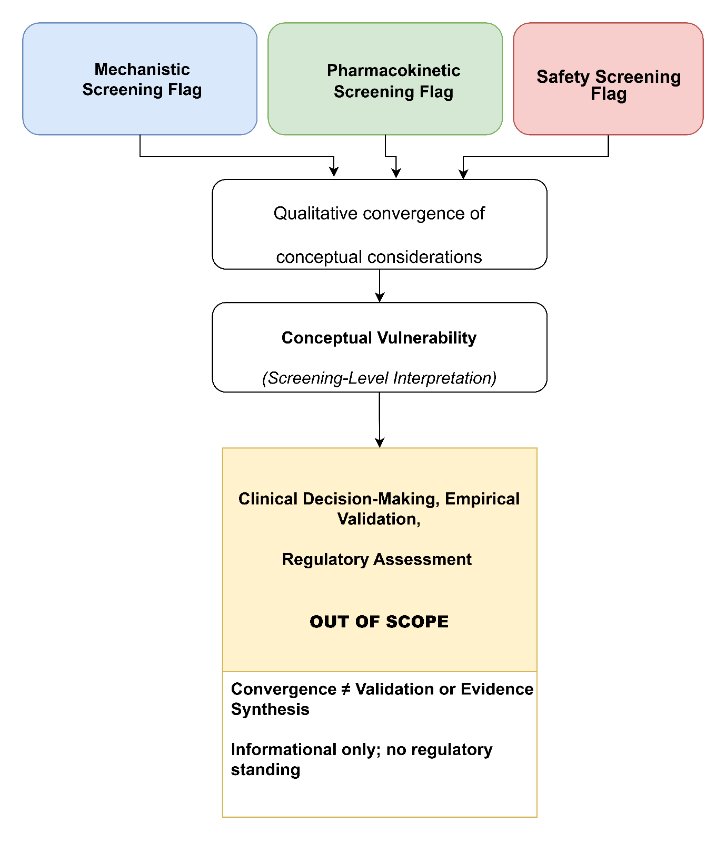 The figure illustrates the qualitative convergence of independent domain-level conceptual flags into an overall screening interpretation, while explicitly demarcating the boundary between preliminary conceptual vulnerability and clinical or regulatory judgment, which remains outside the scope of the framework(1–3,5).