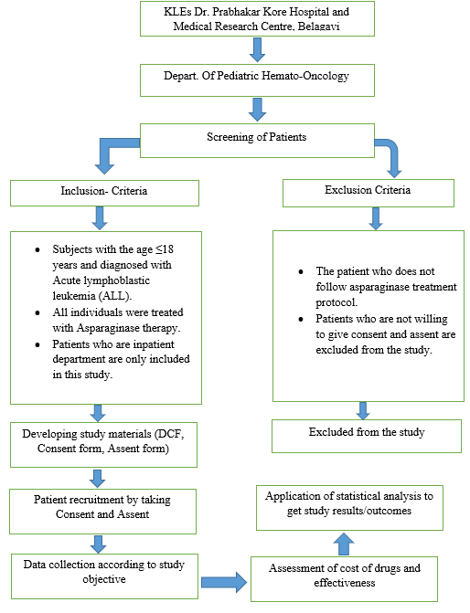 Prospective, observational research was conducted between September 2024 to February 2025 at KLES Dr. Prabhakar Kore Hospital and MRC, Belagavi. During this study reviewed the patient files or patient’s health records of pediatric subjects diagnosed with ALL and also patients received one dose of L-Asparaginase or PEG-Asparaginase dose during this timeframe. The research protocol was reviewed and approved by the Institutional Review Board for clinical research (Ref No. KLECOPBGMEC/D015-2024, dated 30 August 2024).