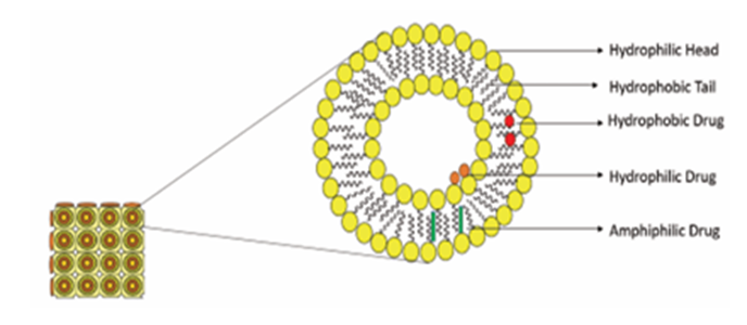 Figure 1: Cubosomes with various drug loading strategies displaying their interior & the cubic shape as well as membrane