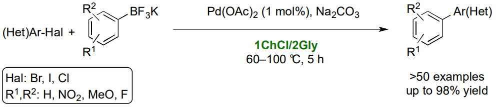 The 1ChCl/2Gly mixture has proven to be an effective reaction medium for chemoselective, ligand-free Suzuki-Miyaura (SM) couplings involving various (hetero)aryl halides (Cl, Br, I). In this process, mono- and bifunctional aryltrifluoroborates serve as nucleophiles instead of boronic acids. The reactions are conducted in air under mild conditions.