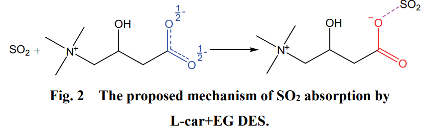 ChCl and glycerol can form a series of deep eutectic solvents (DESs) that effectively absorb SO2, with the absorbed SO2 easily desorbing afterward. The DES with a ChCl to glycerol mole ratio of 1:1 demonstrates the highest SO2 absorption capacity of 0.678 g·g?¹ at 20 °C and 0.1 MPa of SO2. The absorbed SO2 can be recovered at 50 °C under an N2 flow, allowing for the regeneration of the DES. However, NMR analysis shows that the interaction between SO2 and the DES is physical, indicating that it may not be suitable for removing SO2 at low concentrations. Four ChCl-based DESs and found that the ChCl+thiourea DES had the highest absorption capacity of 2.96 mol·mol?¹ at 20 °C and 0.1 MPa of SO2. Deep eutectic solvents (DESs) formed from 1-ethyl-3-methylimidazolium chloride (EMIMCl) and ethylene glycol (EG) in various mole ratios have been tested for SO2 capture. The results showed that the SO2 absorption capacity increased with higher EMIMCl content, with a DES having an EMIMCl to EG mole ratio of 2:1 capturing 1.15 g·g?¹ at 20 °C and 0.1 MPa of SO2. These DESs can effectively absorb high concentrations of SO2 due to physical interactions. However, since SO2 concentrations in flue gas are much lower (around 0.2% by volume), there is a need to develop functional DESs that can chemically interact with SO2 for effective capture in low-concentration scenarios.