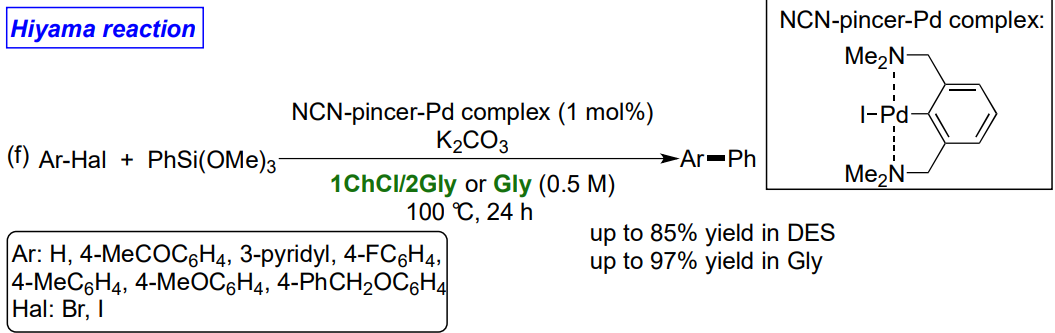 Hiyama-type cross-coupling reactions involving aryl halides and various organosilanes have been successfully conducted in either a biomass-derived eutectic mixture like 1ChCl/2Gly or in Gly, using an engineered NCN-pincer-Pd complex as the catalyst. This catalytic system can be effectively recycled up to three times in a deep eutectic solvent (DES), and the reactions have also been scaled up to gram quantities. Experimental findings suggest that the mechanism operates through a Pd(II)/Pd(IV) catalytic cycle.