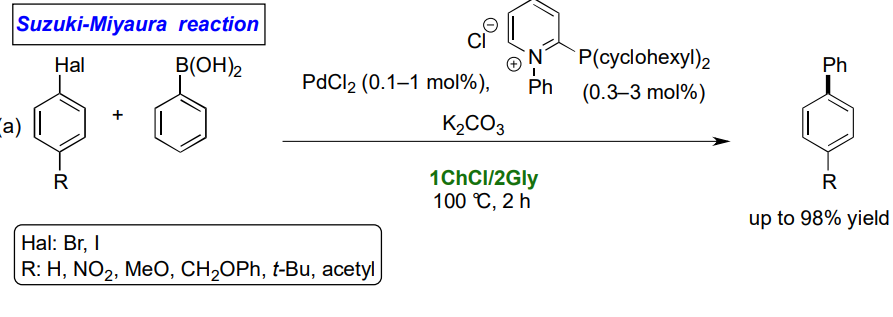 Deep eutectic solvents (DESs) have garnered significant attention as reaction media for transition metal-catalyzed cross-coupling reactions due to their ability to facilitate these reactions under milder conditions while allowing for the recycling of both the catalyst and solvent, enhancing the process's sustainability.