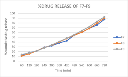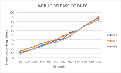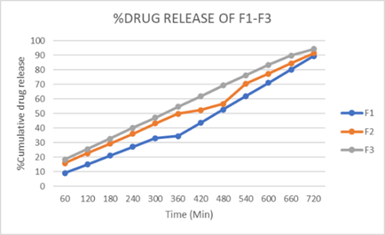 The % drug release for formulation F3 was found to be between 18.32 % to 94.27%.