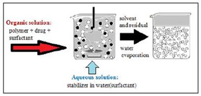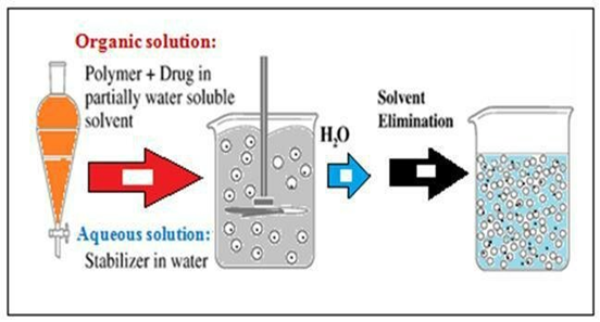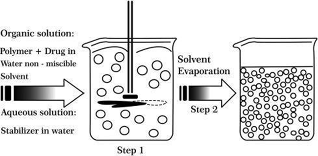 The solvent evaporation method is one of the earliest and most widely employed techniques for the preparation of polymeric nanoparticles (Fessi et al., 1989; Couvreur et al., 1977; Li et al., 2008; Parveen et al., 2012). In this process, a nanoemulsion is first prepared by dissolving a biodegradable polymer (such as PLGA, ethyl cellulose, or polycaprolactone) in an organic solvent such as ethyl acetate, chloroform, or dichloromethane. The drug to be encapsulated is then dispersed within this organic phase.