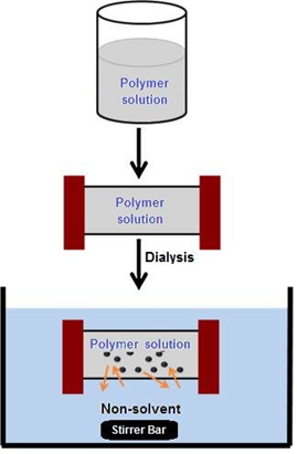 Dialysis is a successful technique for creating nanoparticles. This process involves first dissolving the medication and polymer (such as poly(benzyl-l-glutamate)-b-poly(ethylene oxide) or poly(lactide)-b-poly(ethylene oxide)) in an organic solvent. Dialysis was conducted using this solution in a dialysis tube beside a non-solvent miscible. The increasing aggregation of the polymer as a result of a loss of solubility and the creation of uniform suspensions of nanoparticles occur when the solvent is displaced inside the membrane. The dialysis process for the creation of nanoparticles is not fully known at present. The mechanism behind it might be comparable to that of nanoprecipitation.