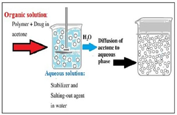 In this process, a polymer and drug are first dissolved in the organic solvent and then emulsified into an aqueous phase containing a salting-out agent and stabilizers such as polyvinyl alcohol (PVA), poly(ethylene oxide) (PEO), or hydroxyethylcellulose. Upon subsequent dilution with water, the solvent diffuses into the aqueous phase, leading to precipitation of polymeric nanospheres. The absence of high shear energy or elevated temperature makes this method suitable for thermosensitive drugs and easily scalable for industrial production (Ibrahim et al., 1992; Catarina et al., 2006; Bilati et al., 2005).