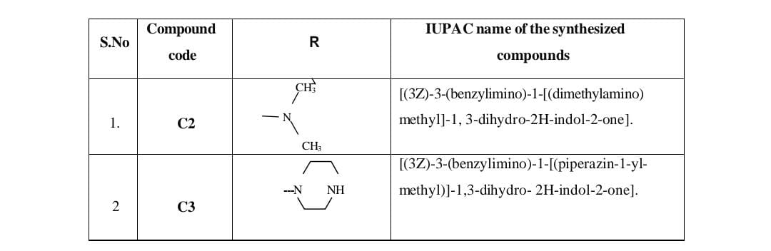The previously synthesized compound, 3-(benzylimino)-1,3-dihydro-2H-indol-2- one (0.01 mol), was dissolved in 10 mL of methanol. To this solution, the appropriate secondary amine (0.01 mol) was added separately, followed by the addition of formaldehyde (0.01 mol, 37%) with continuous stirring. The mixture was stirred using a magnetic stirrer for 3 hours, after which it was left to stand at room temperature for 24 hours. The resulting precipitate was collected, recrystallized from methanol, and dried in a hot air oven. The purity of the final product was confirmed using thin-layer chromatography (TLC), with an (C2) Rf value of 0.60, (C3) Rf value of 0.30.