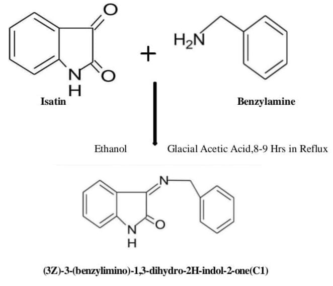 To synthesize benzylimino-isatin, 0.001 mole of indole-2,3-dione (isatin) was dissolved in 30 mL of ethanol in a 250 ml round-bottomed flask equipped with a condenser. In a separate container,0.001 mole of benzylamine was dissolved in 10 mL of ethanol and then added to the isatin solution. To this mixture, 3-4 drops of glacial acetic acid were added. The reaction mixture was heated under reflux for 8-9 hours. After the reaction was complete, the resulting precipitate was filtered, recrystallized from ethanol, and dried in a hot air oven. The purity of the final product was confirmed using thin-layer chromatography (TLC), with an Rf value of 0.45.