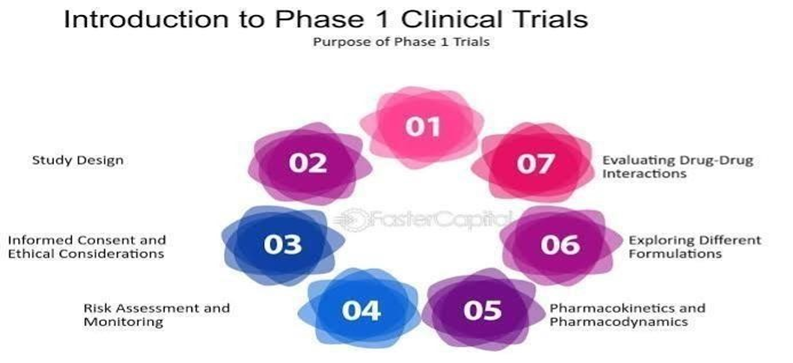 A new drug's safety profile, higher allowable dosage, toxicity thresholds , PK also PD behaviour are the primary goals of phase I studies, which are the initial stage of human testing. Small cohorts of three to six patients are usually included in these studies, and doses are progressively increased until two or more patients experience intolerable toxicity at a certain dose level, indicating a DLT; the dose slightly below this threshold is known as the MTD. Because Phase I trials focus on safety rather than therapeutic benefit, participants typically include people with advanced, treatment resistant malignancies, regardless of tumour type. While pharmacodynamic evaluations aid in identifying the drug's biological effects on certain molecular targets, pharmacokinetic investigations offer details on the drug's absorption, distribution, metabolism, and elimination. PK–PD interactions are especially crucial for determining biologically efficacious dosages and ideal therapeutic exposure levels for molecularly targeted treatments. In general, safety, tolerability, MTD identification, and early signs of biological activity are the main outcomes of Phase I trials. [16,17,18]