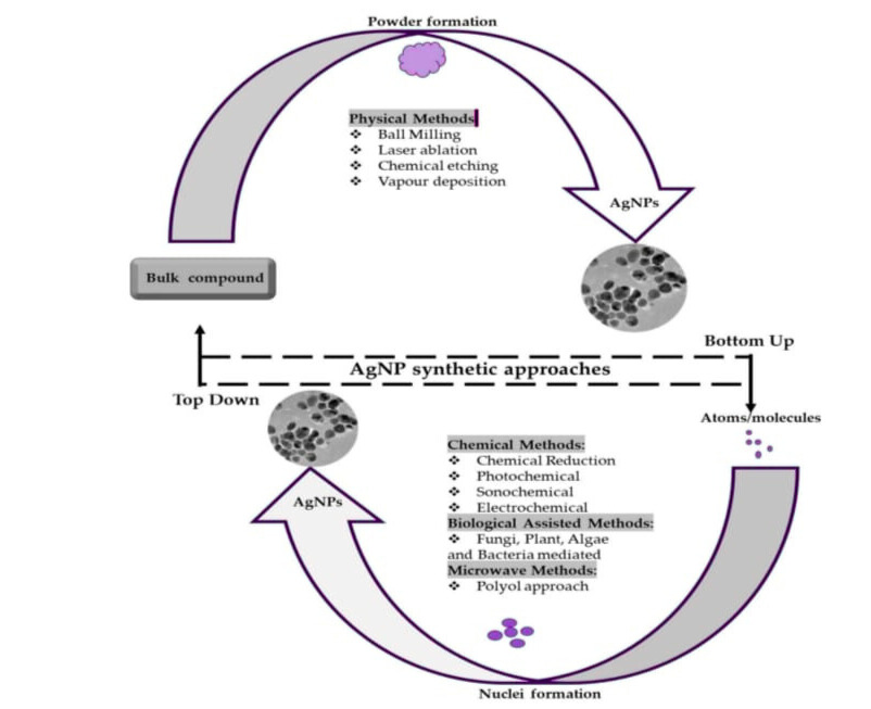 There are two primary strategies for producing silver nanoparticles: the top -down and the bottom -up approaches. These approaches can be carried out using physical, chemical, or biological methods. Generally physical techniques follow the top – down route, while chemical and biological methods rely on bottom -up synthesis. In the top- down method, a bulk material is taken as the starting point and broken-down step by step into smaller particles until nanoparticles are obtained. On the other hand, bottom -up method builds nanoparticle by assembling atoms and molecules. This approach is generally less toxic, more cost effective and more efficient.